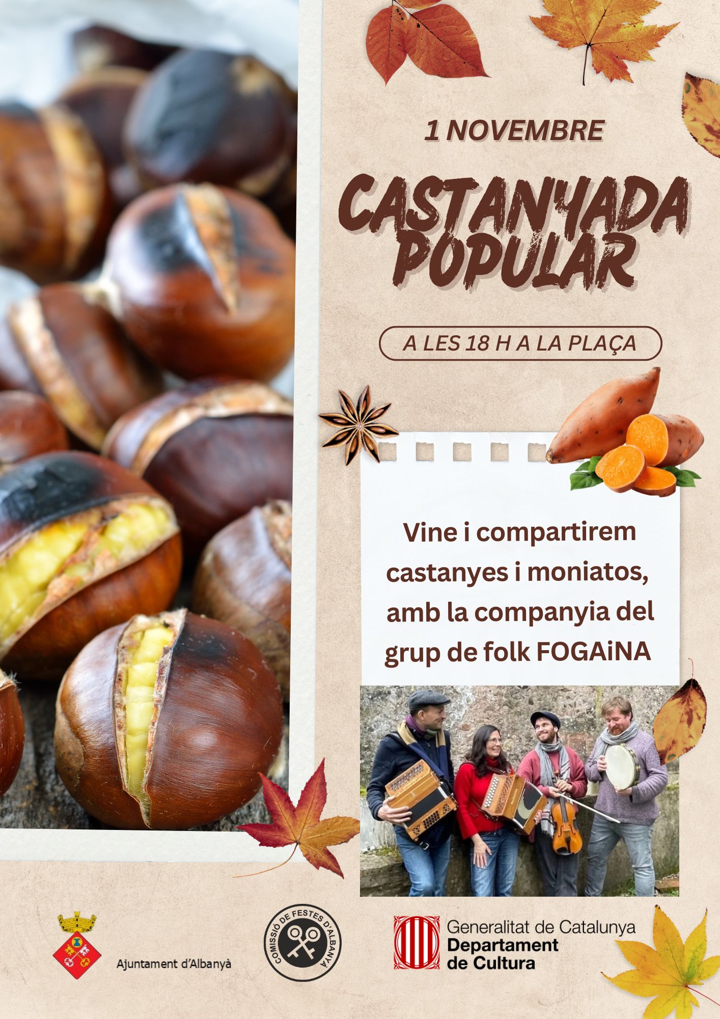 Dia 1 de novembre, a partir de les 18 h, ens trobarem a la plaça per celebrar la castanyada tots junts. Ens acompanyarà el grup música folk Fogaina.